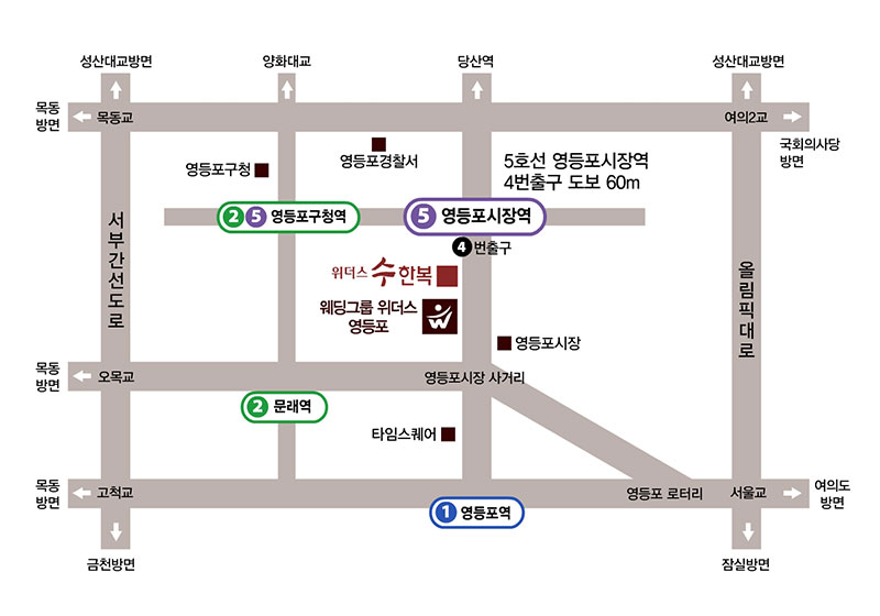 위더스 수한복 위더스 수한복 오시는 길 주소 및 연락처 서울 영등포구 영중로 65 2층 위더스 수한복 웨딩그룹위더스 영등포에서 영등포시장역방면 도보 60m 연락처 010-2116-7553 Subway 지하철 5호선 영등포시장역 하차 4번 출구 → 도보 60m Bus 버스 영등포시장 하차 간선버스 605, 661, 761번 지선버스 5616, 5714, 6514번 광역버스 9707번 직행버스 1082, 1500, 8000, 9030, G6002번 좌석버스 700, 830, 870, 871번 일반버스 5, 60, 60-3, 88번 공항버스 6007번 위더스 수한복 약도 네이버 지도로 보기
